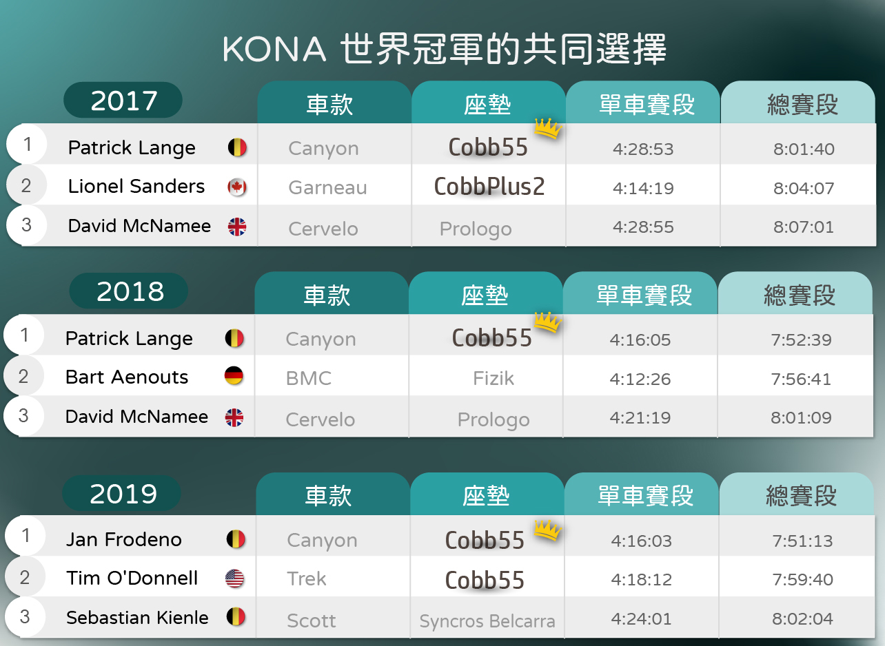 因此,JCOB的Type 5系列(舊名Cobb 55),稱霸近三年的KONA賽場,成為冠軍使用的「冠軍座墊」這樣的殊榮,更彰顯了好的產品不會寂寞。 JCOB的座墊Cobb 55從2017年至2019年連續三年都成為冠軍的選擇,同時在2019年的KONA部品統計中,JCOB的座墊,榮獲10%的市占率,沒錯就是10%!排名第四位(前三名都是成車搭配的座墊)