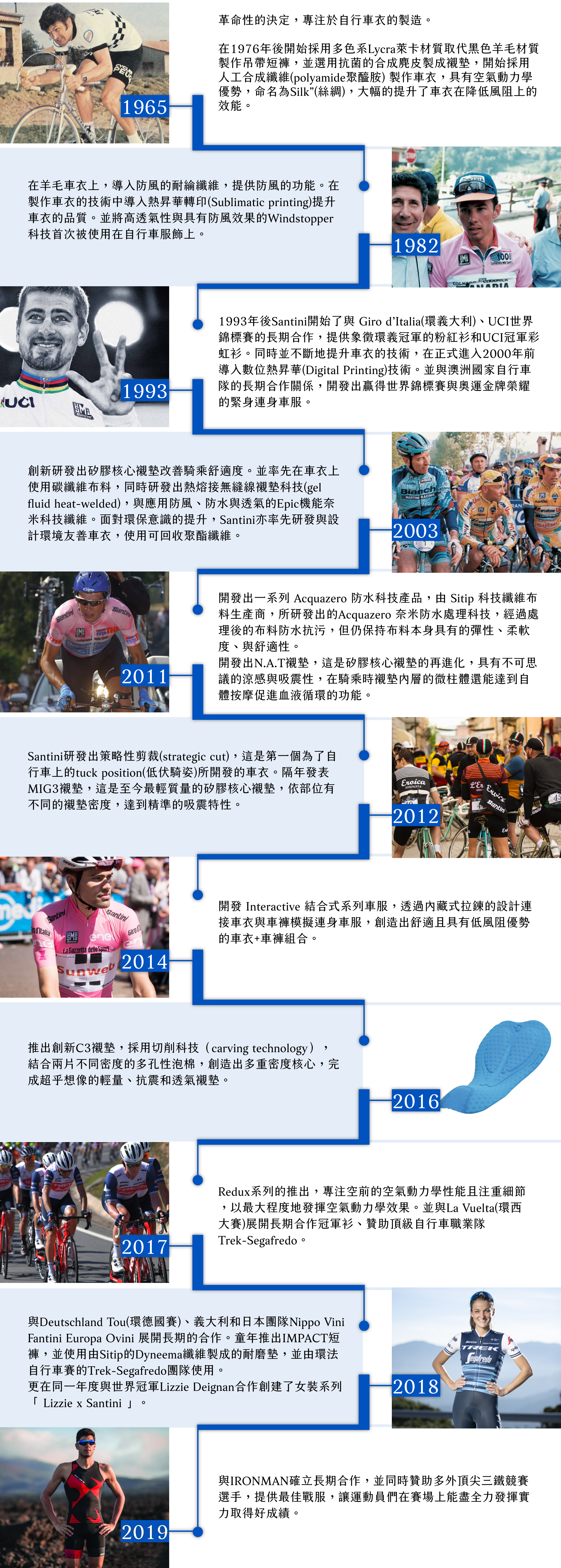 Santini 的歷史充滿了許多世界第一的頭銜,過去積累的每一步,都成為我們持續創新的基石。讓我們持續專注在創新更優質精良的自行車服飾上,並且堅持於義大利手工製造。