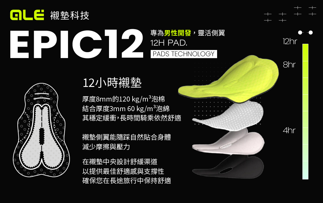 Epic12襯墊,適合超過12小時以上的長途騎乘。多層結構保證了長久的性能與舒適,符合人體工學的外型設計,消除了任何摩擦,Epic讓冒險無限延伸。
