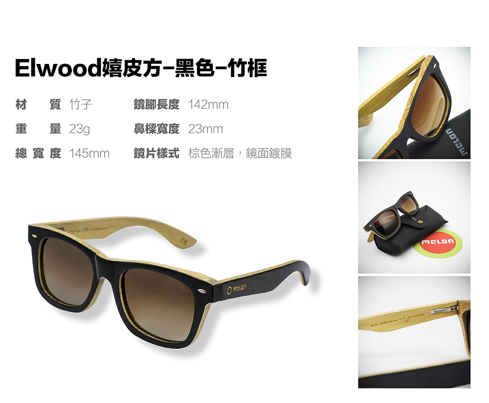 | 品名 | Melon®太陽眼鏡-Elwood嬉皮方-黑色-竹框 |