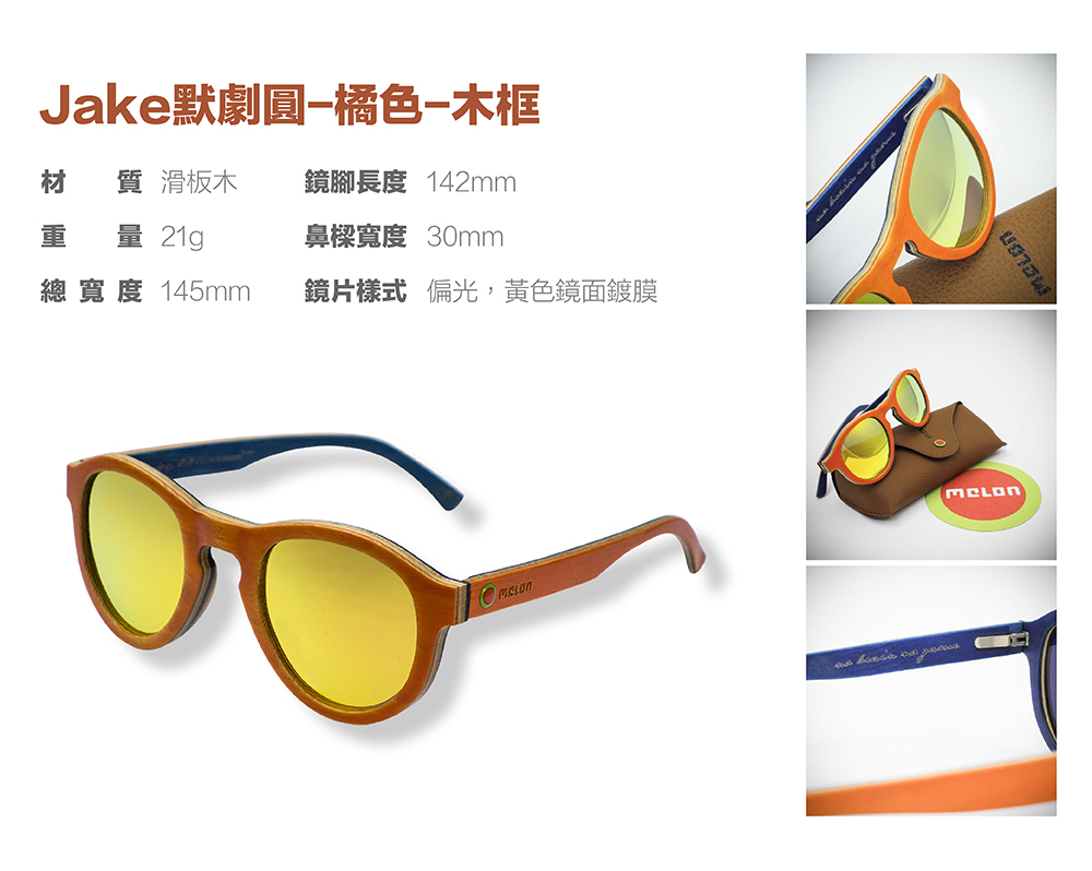 | 品名 | Melon®太陽眼鏡-Jake默劇圓-橘色-木框 |