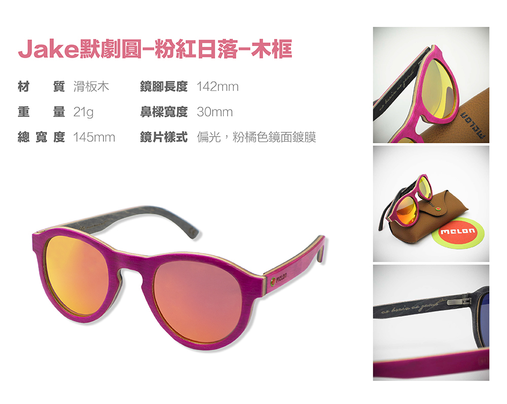 | 品名 | Melon®太陽眼鏡-Jake默劇圓-粉紅日落-木框 |