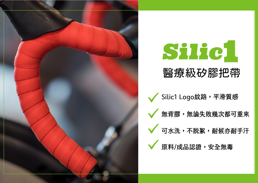 採用TUV無毒認證醫療級矽膠搭配特殊工法,提升舒適度與耐久度,遇到髒污可水洗不損壞,各種溫度與氣候下仍可提供優良操控性能。無背膠設定讓纏繞更輕鬆。無花紋素面設計提供絕佳的操控路感。